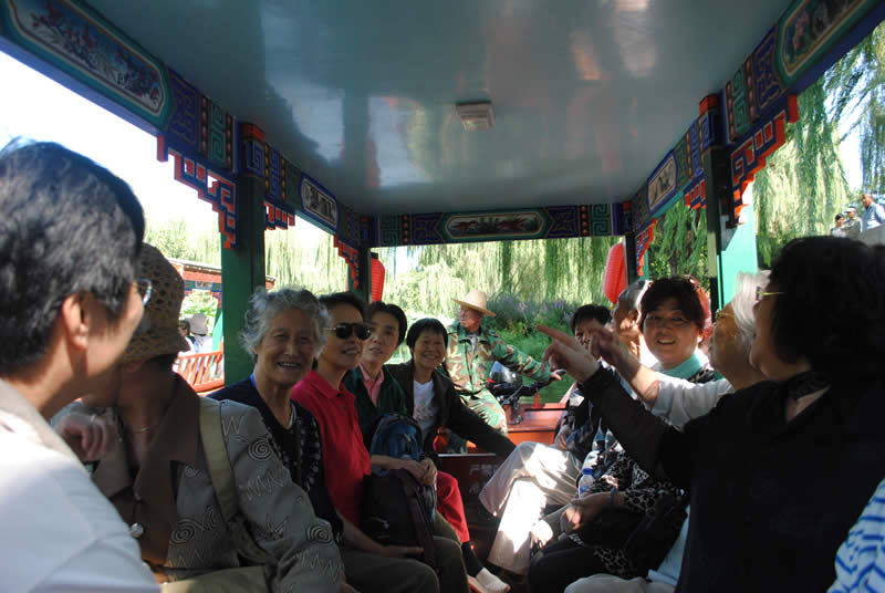 一路欢歌笑语,蓝天白云,空气清新的可以看见远山。大家热情高涨,乘船感受圆明园的变化。圆明园在历史上就是一座水系相连的大型皇家园林,其陆上建筑面积和故宫一样大,水域面积又等于一个颐和园。水上泛舟,大家仿佛置身于江南水乡。放眼望去,满眼的荷叶,不禁使人感觉正置身于朱自清《荷塘月色》的美景之中。
